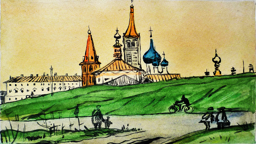 Пейзаж с церковью, акварель